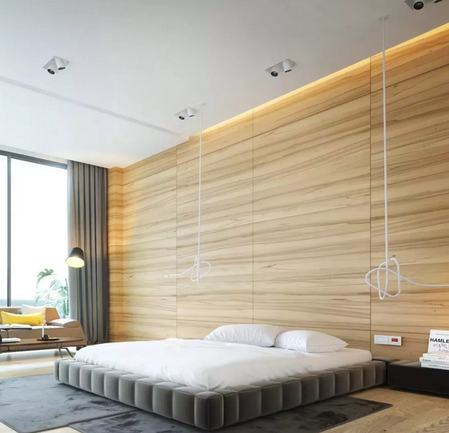 近年來北歐、日式風(fēng)格逐漸盛行,原木也開始成為設(shè)計上的主打材質(zhì), 用木飾面代替相框、裝飾畫來進行臥室裝扮,新意十足。