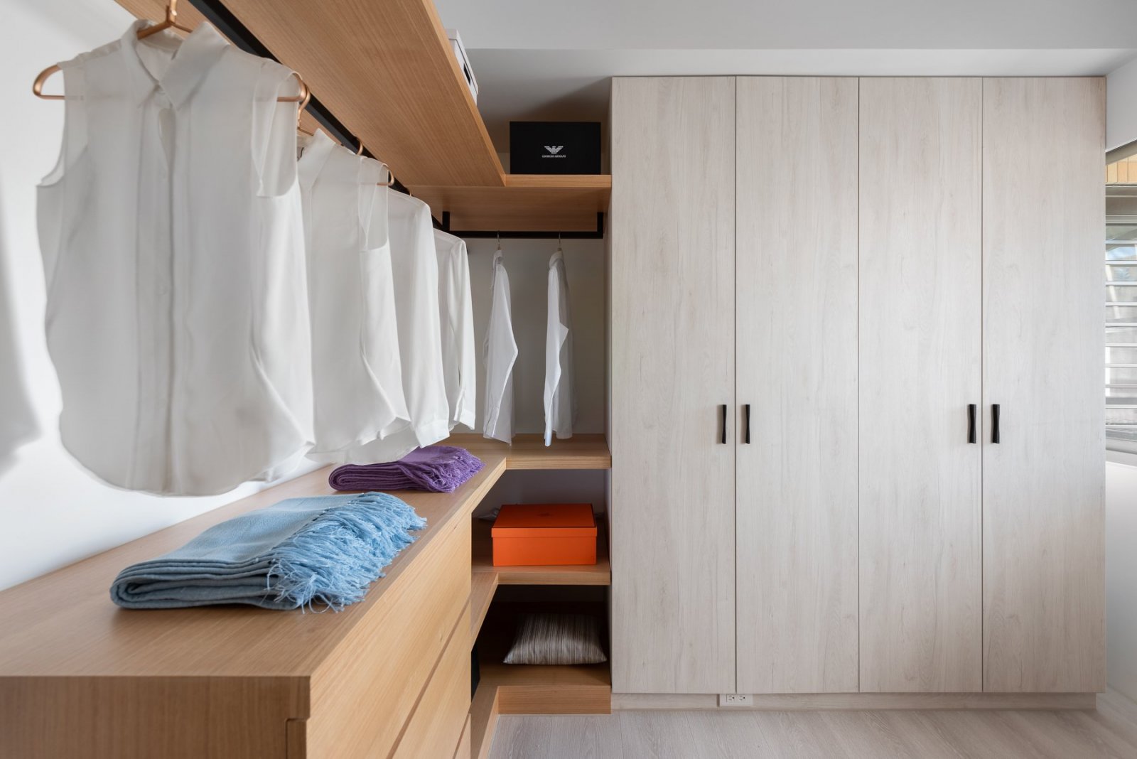 空間利用與使用比率一般有兩種,一種是建筑本身分割出來的,一種是通過自己或設計師,重新分割空間劃分出來的,實際上后者在空間上并不需要大,夠用就行。不常穿的衣物,不要占用空間,這是流動空間的優化體現。