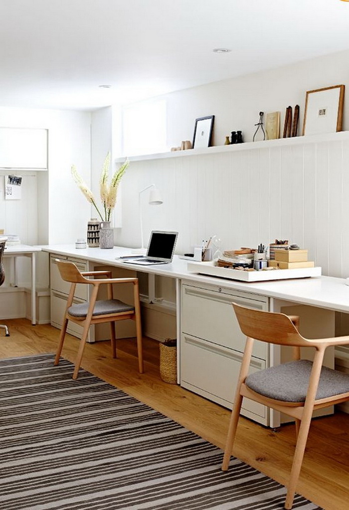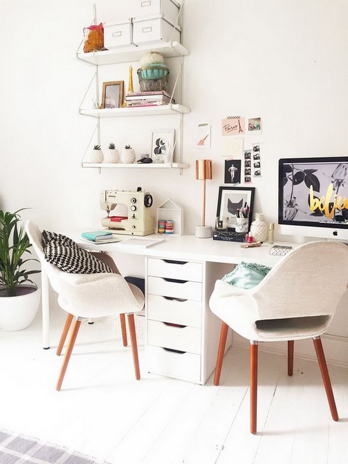 對于兩個人書桌布置,可以對著坐、并排坐或者背靠背,也可以L型轉角坐,看個人喜好和具體空間格局而定。