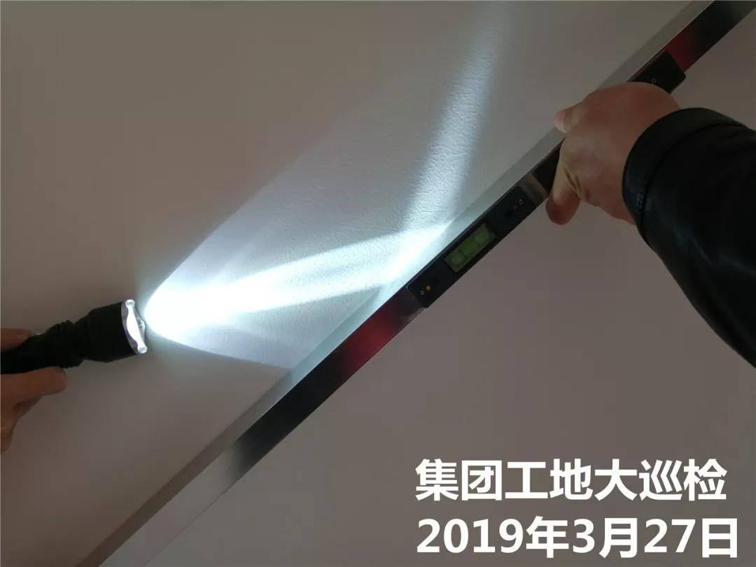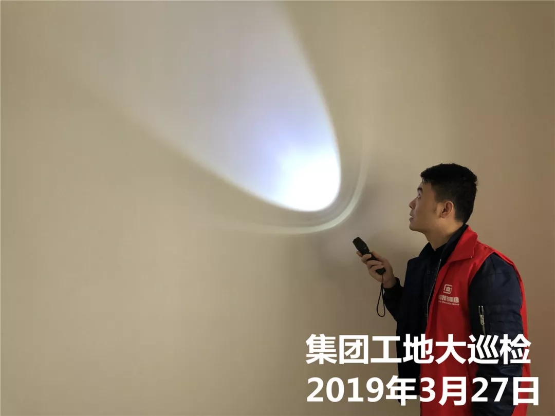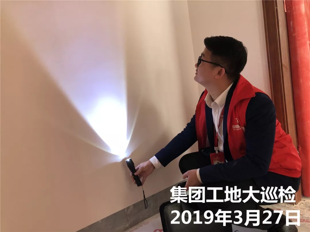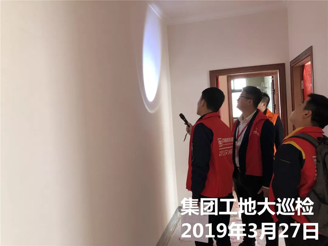 運營部成云總經(jīng)理與張立安總經(jīng)理用強(qiáng)光手電筒檢查墻面膩子施工