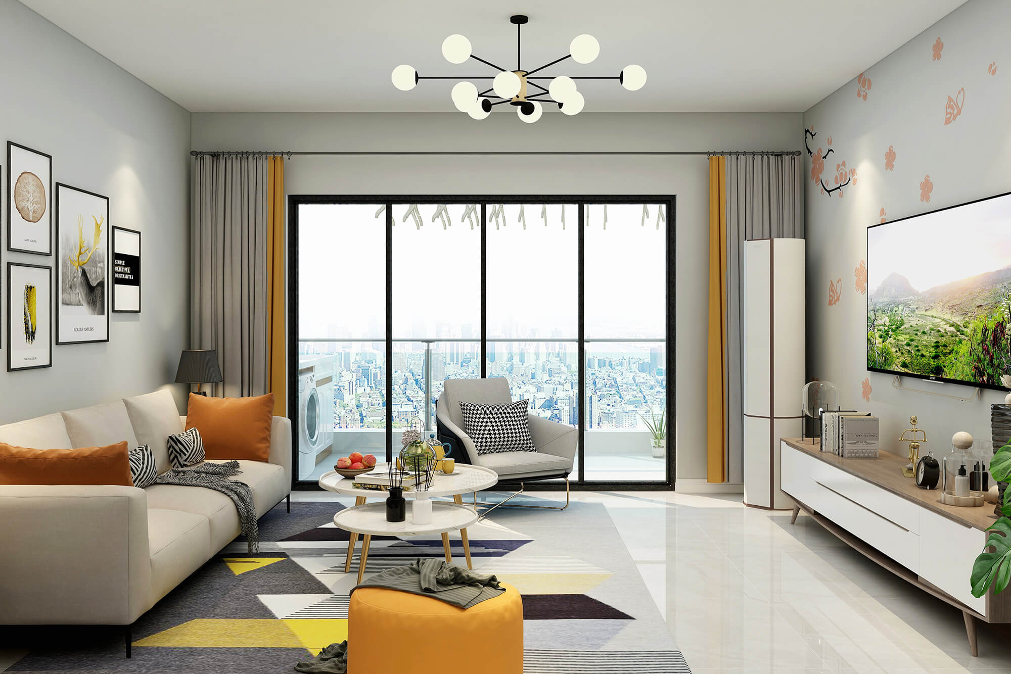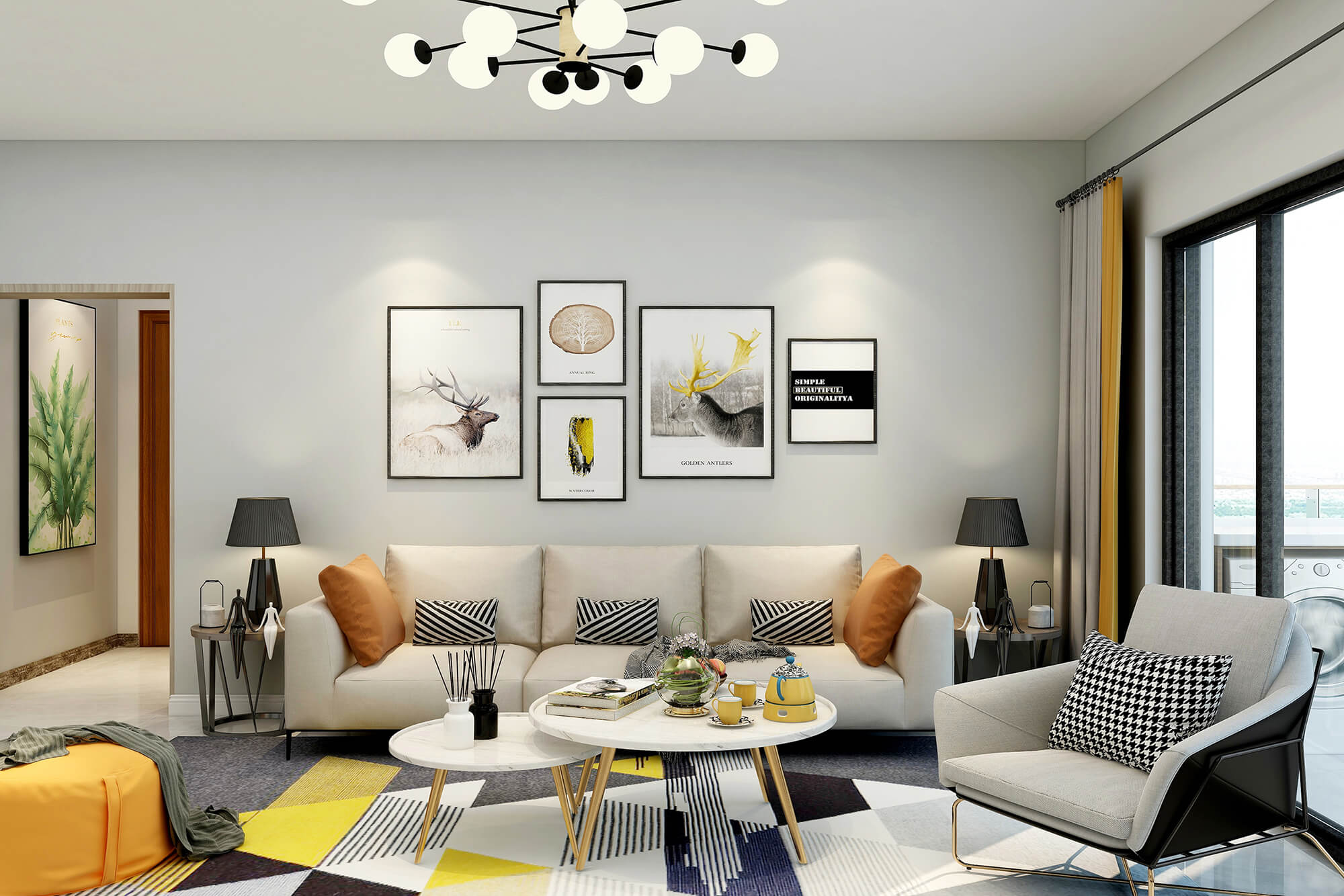 白色與米白色的搭配看起來干凈又溫柔,加上地毯里一抹明黃的顏色與沙發的橙色抱枕和橙色圓凳的跳色讓溫柔的搭配里又多了絲活潑,加上綠植點綴更好的融合了整體空間的色彩搭配。