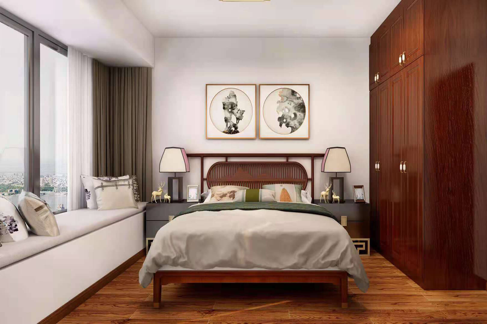 房子整體家具以紅木為主??蛷d采用白色地磚和留墻面與家具搭配讓顏色看起來更為簡潔,不做裝飾的吊頂讓整體的空間看起來更寬大。房間采用紅木地板與房間家具色彩呼應,墻面留白用水墨畫裝飾讓房間裝飾更豐富,也讓色彩更多了層次感。