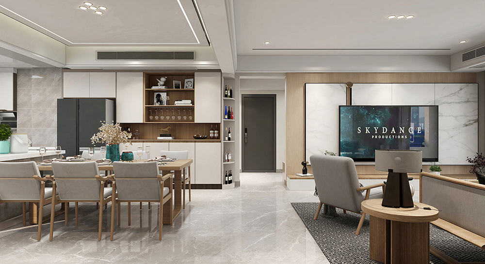 本案例128㎡的新中式風格。中式與禪意的結合帶給人一種寧靜脫俗、含蓄內斂的感覺,營造出一種令人輕松自然的端莊雅致氛圍。現代元素的點綴,讓空間不乏時尚感。