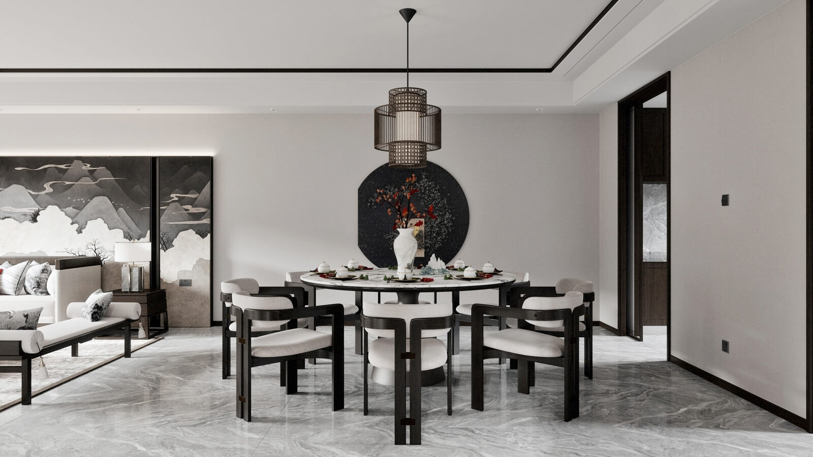瀏覽量:1138設計師打破了人們對傳統(tǒng)中式風格的固有觀念,加入了許多現(xiàn)代化的設計元素。其中,中國風味一點兒也沒少。山水畫,瓷器,深色桌椅,這些富含古典韻味的裝飾,完美地與現(xiàn)代化的空間融為一體,體現(xiàn)出靜謐的美感。