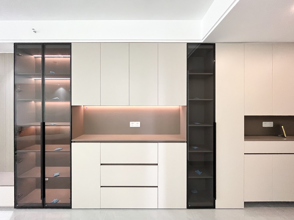 原始戶型的結構非常的方正,通過拆除客廳與陽臺之間的墻體,讓客廳的空間變得更加的開闊通透。在玄關、客廳臥室等地方增加柜體,增大了儲物空間。