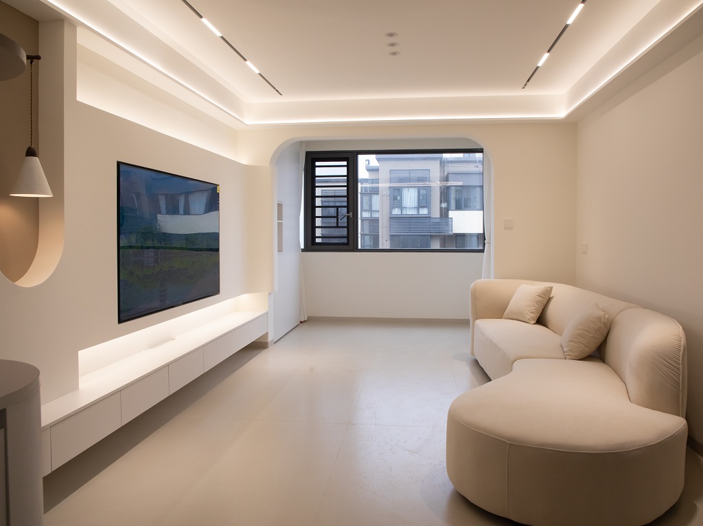 空間整體奶白色調裝飾,耶為空間帶來了充沛的光線,設計師整體結構上不設明顯的界定,在裝修次材料、色彩搭配上逐步描述空間的構成關系。