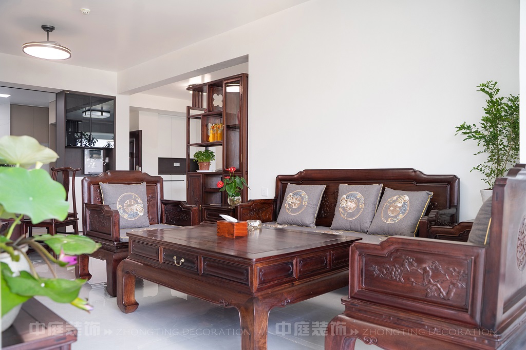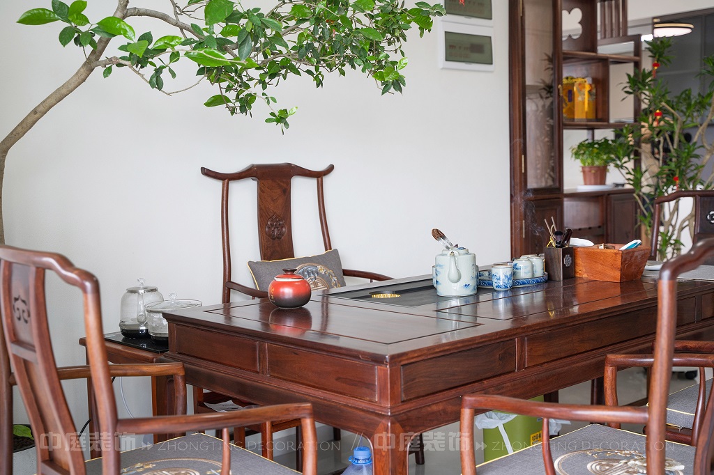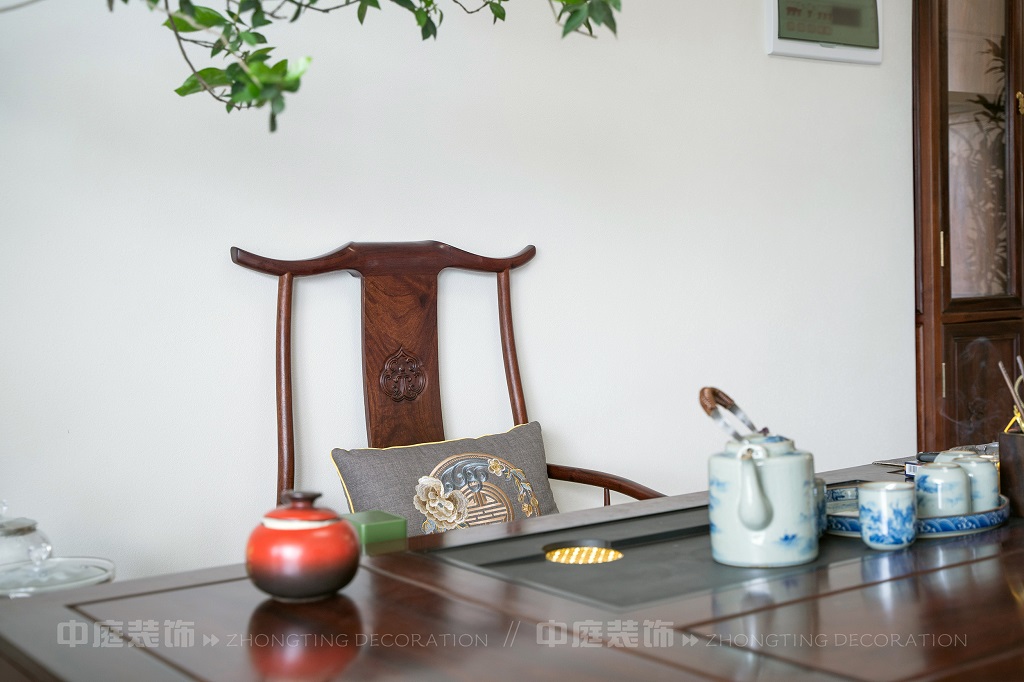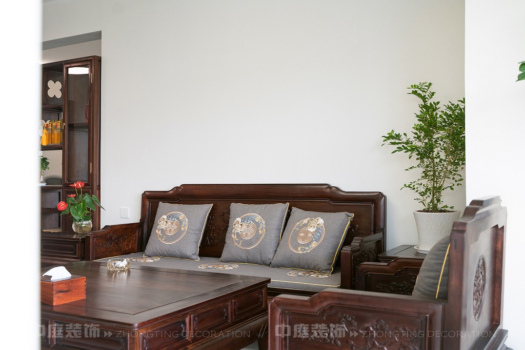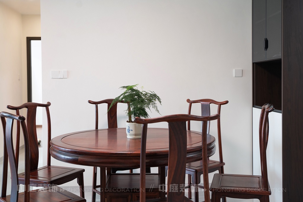 全屋以深色實木家具為主,雕花工藝精致細膩,盡顯中式家具的古樸質感。搭配帶有傳統紋樣的抱枕,在細節處傳遞中式美學??臻g中綠植點綴其間,與木質家具相得益彰,營造出自然清新的氛圍。無論是客廳的沙發組合,還是茶室的茶桌茶具,亦或是餐廳的圓桌設計,都在簡約的現代空間里,勾勒出中式家居的典雅與詩意。