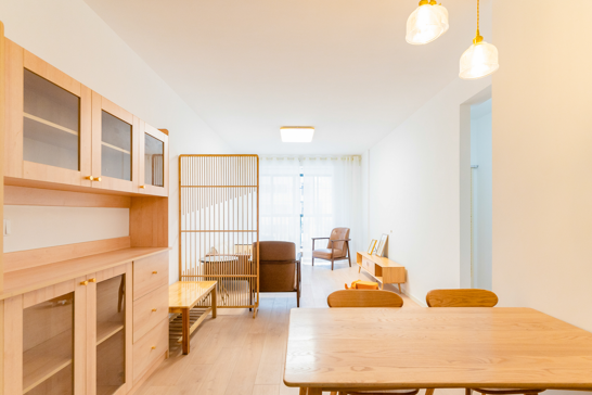 整個空間基于原木風(fēng)格上做搭配,陽臺打通,解決不互通的采光問題,天氣陰晴,都可以為空間做天然點綴;開放式廚房和餐廳可以共享操作,互不干擾,又可以加強家人之間的互動性提高家庭的幸福感。